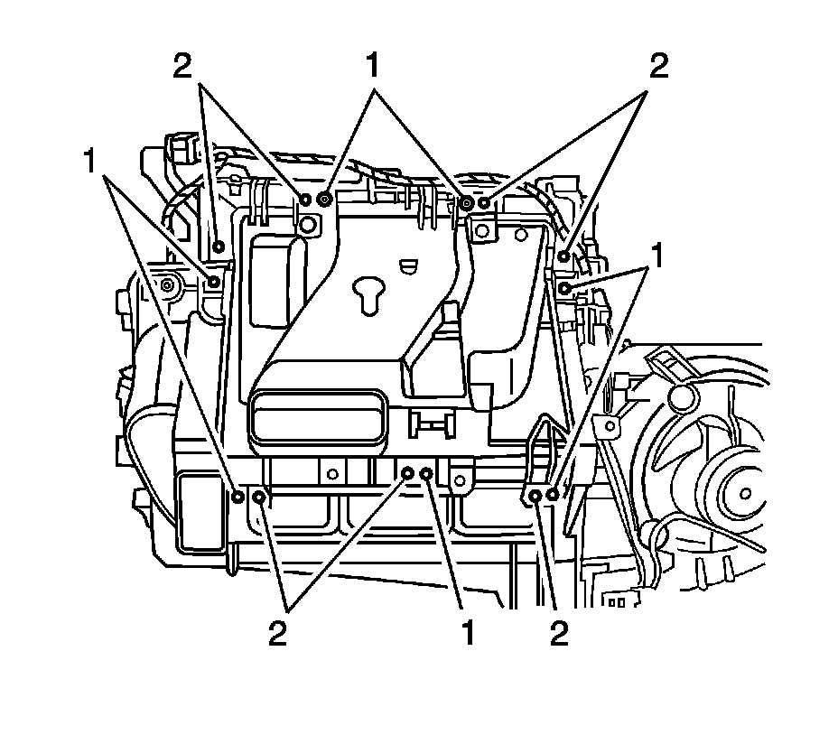 15. Remove the heater core cover heat stakes (1) with a small chisel.