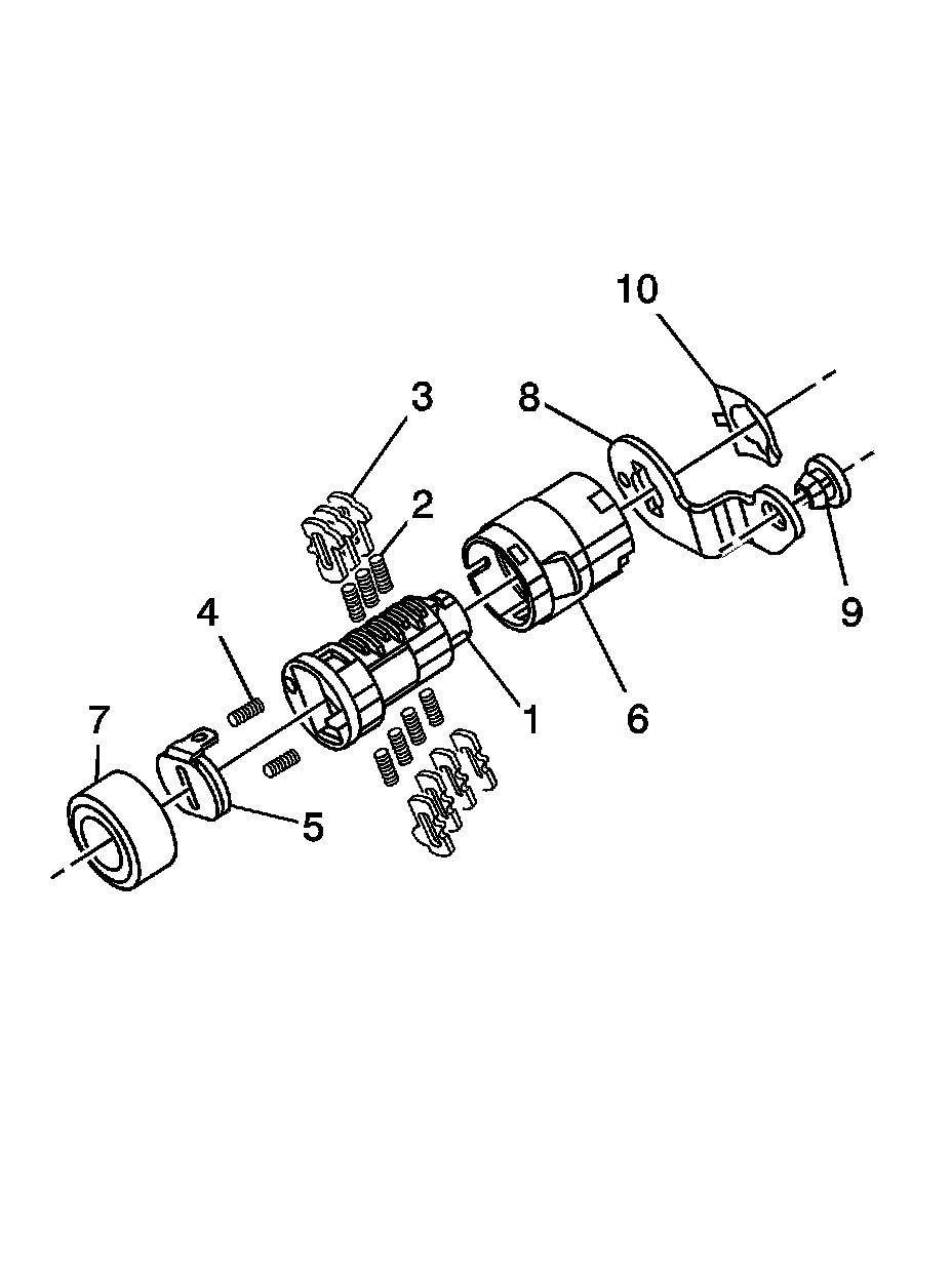 The ignition lock cylinder only uses 7 of the 10 cut positions, 2 through 8. The ignition cylinder tumblers (3) are located on alternate sides of the cylinder (1). They are snap-in and self-retaining. It follows the key code with the first tumbler being the first depth of the key code, closest to the head of the key.