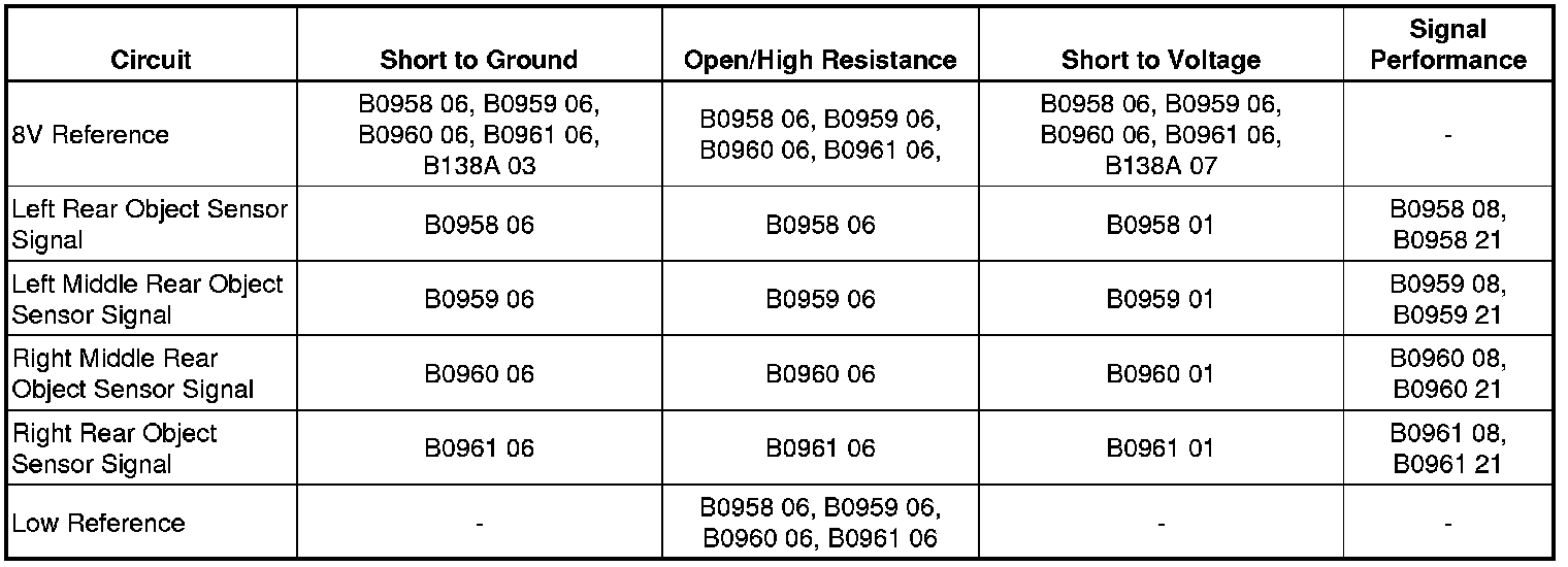 The object sensors are 3-wire sensors that are used to determine the distance between the vehicle and an object of interest. The parking assist control module supplies 8 V to the object sensors via the 8 V reference circuit and provides ground via the low reference circuit. The parking assist control module triggers the sensors in a sequential loop. After each sensor transmits, the parking assist control module uses the sensor echo received through the signal circuit to calculate the distance and position of an object.