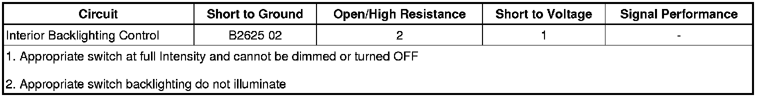 Ignition ON, switch ON exterior lighting, vary the interior backlight from dim to full bright by using the dimmer switch. The LED of the S31D Seat Heating and Cooling Switch - Driver, S31P Seat Heating and Cooling Switch - Passenger, S48C Multifunction Switch 1 - Instrument Panel and S48D Multifunction Switch 2 - Instrument Panel should dim and then become full bright.