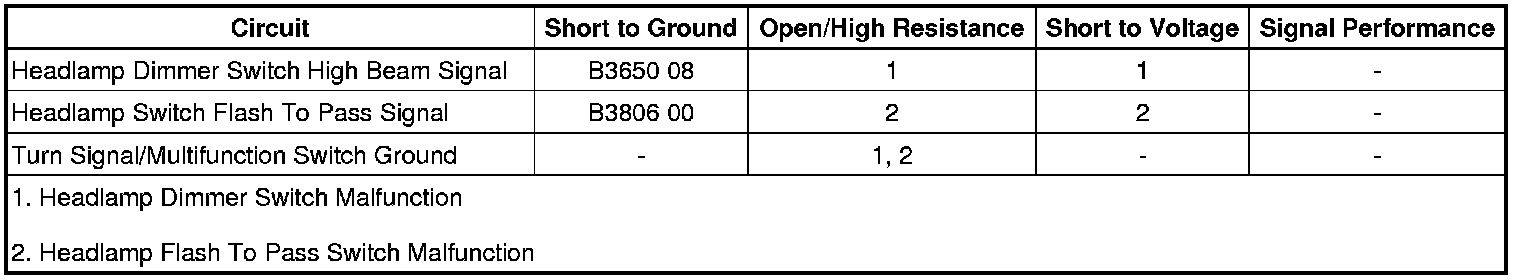 The BCM monitors the voltage level within the headlamp dimmer switch high beam signal circuit and the flash to pass signal circuit. When the turn signal/multifunction switch is moved to the high beam position or to the flash to pass position, the voltage within the appropriate signal circuit drops to less than 1V. The BCM will detect the voltage drop and will command the headlamp high beams to turn ON or OFF.