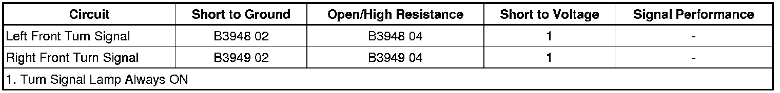 Ignition ON, command the appropriate Front Turn Signal Lamp ON and OFF with a scan tool. The appropriate front turn signal lamp and turn signal repeater light should be turn ON and OFF when changing between the commanded states.