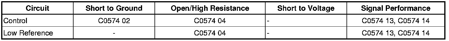Ignition ON. Verify that DTC C0574 02 or 0574 04 is not set.