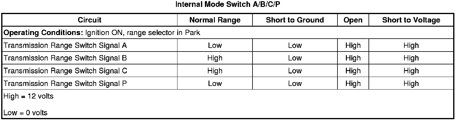 2. Ignition ON, engine OFF, observe the scan tool Internal Mode Switch A/B/C/P parameter while moving the gear shift lever from Park, to Reverse and through all the ranges. The parameter should match each gear range that is selected. Refer to Transmission Internal Mode Switch Logic (Transmission Internal Mode Switch Logic).