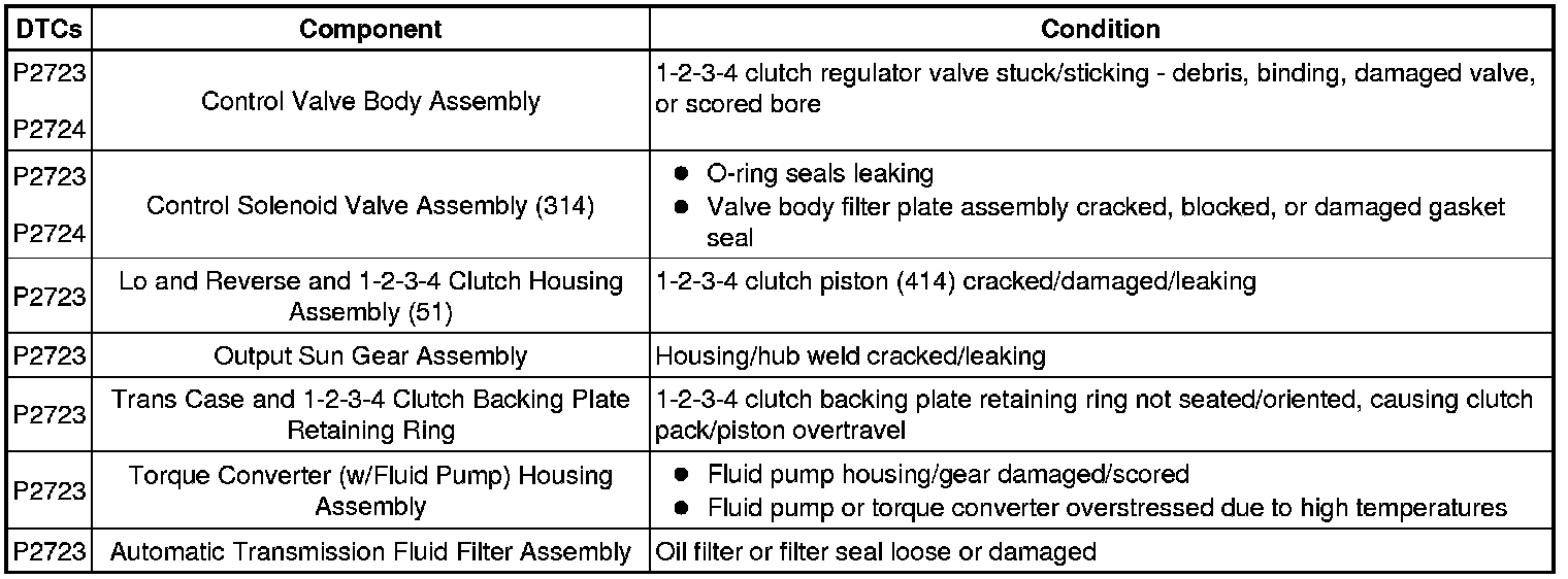 The clutch pressure control (PC) solenoid 5 is part of the control solenoid valve assembly, which has no serviceable components. The PC solenoid 5 regulates transmission fluid pressure (TFP) to the 1-2-3-4 regulator valve which controls pressure to the 1-2-3-4 clutch. The transmission control module (TCM) calculates gear ratio based on the RPM signals from the input speed sensor (ISS) and the output speed sensor (OSS). The TCM compares the expected transmission gear ratio to the calculated gear ratio for each commanded gear.
