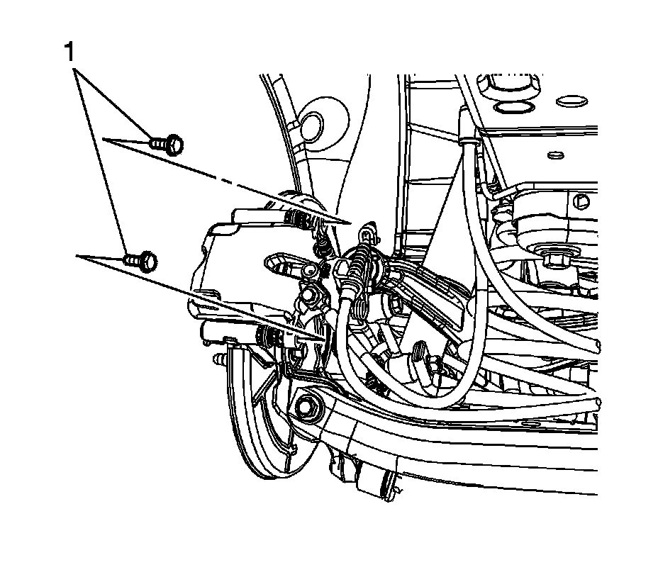 Caution: Support the brake caliper with heavy mechanic wire, or equivalent, whenever it is separated from its mount and the hydraulic flexible brake hose is still connected. Failure to support the caliper in this manner will cause the flexible brake hose to bear the weight of the caliper, which may cause damage to the brake hose and in turn may cause a brake fluid leak.