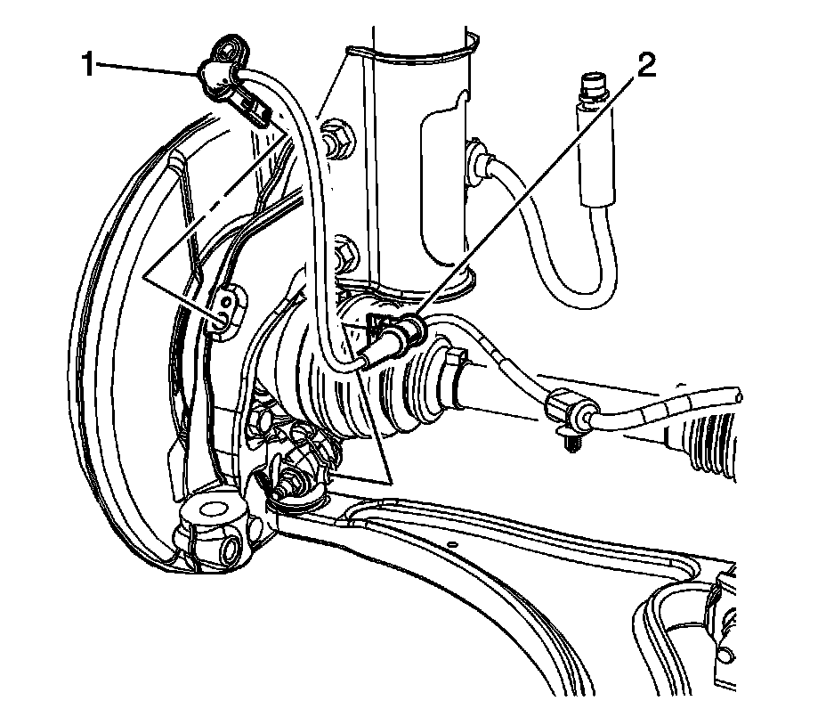 9. Release the harness clip (2) from the steering knuckle and remove the wheel speed sensor.