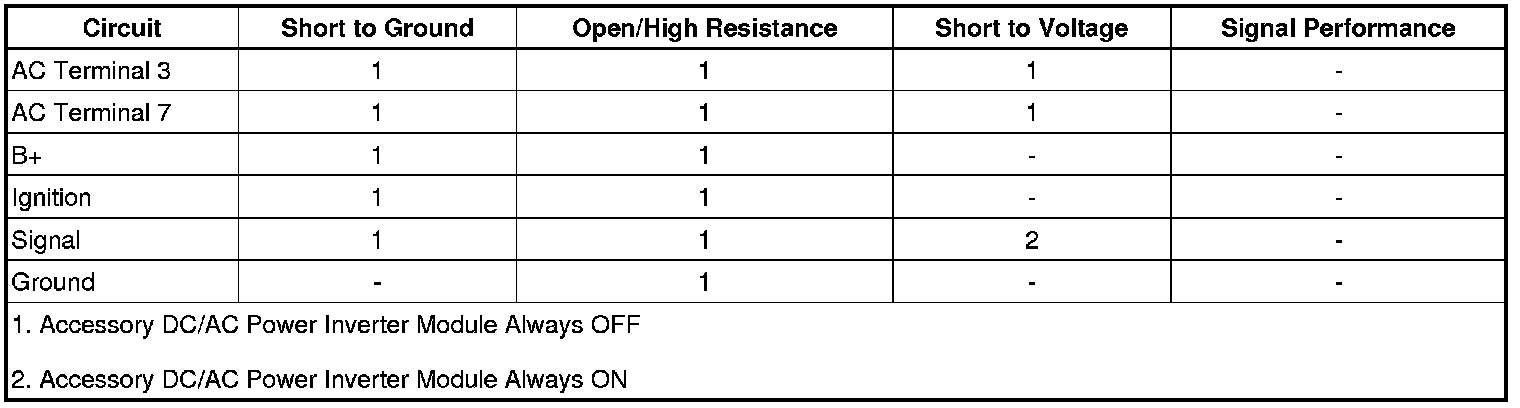 The accessory DC/AC power inverter module converts 12 V direct current (DC) battery voltage to 110 V at 60 Hertz (Hz) alternating current (AC) in order to operate AC powered devices. The accessory DC/AC power inverter module provides up to 150 watts of power. The accessory DC/AC power inverter module is connected to a chassis ground circuit and receives fuse protected battery voltage.