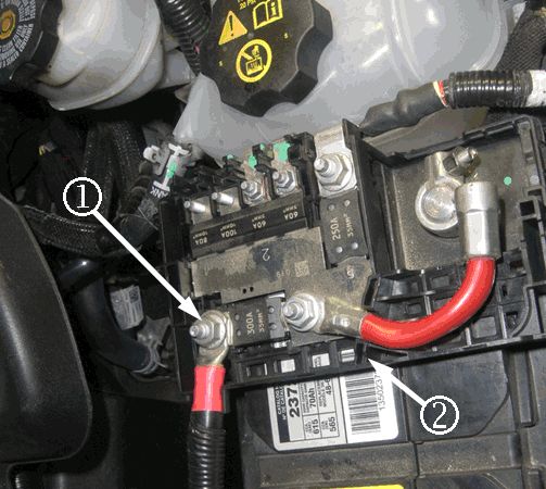 5. Remove the alternator lead cable (1) from the fuse assembly (2).