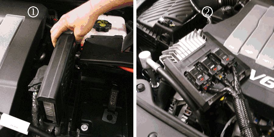 9. Release the ECM retaining tab (1) and place the ECM away from the surge tank work area (2) as shown in the illustration.