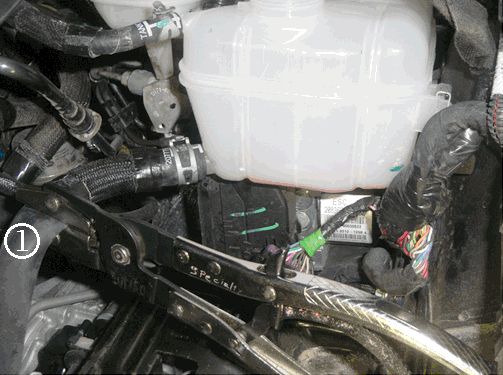 13. Place a hose clamp tool on the surge tank outlet hose (bottom hose) (1). Refer to the illustration.
