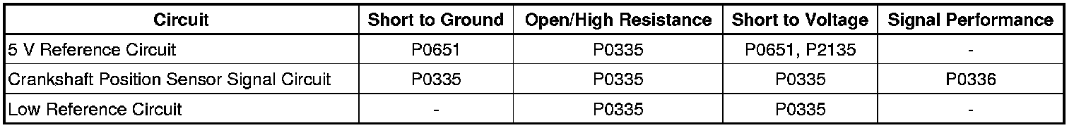 The crankshaft position sensor circuits consist of an engine control module (ECM) supplied 5 V reference circuit, low reference circuit and an output signal circuit. The crankshaft position sensor is an internally magnetic biased digital output integrated circuit sensing device. The sensor detects magnetic flux changes of the teeth and slots of a 58-tooth reluctor wheel on the crankshaft. Each tooth on the reluctor wheel is spaced at 60-tooth spacing, with 2 missing teeth for the reference gap. The crankshaft position sensor produces an ON/OFF DC voltage of varying frequency, with 58 output pulses per crankshaft revolution. The frequency of the crankshaft position sensor output depends on the velocity of the crankshaft. The crankshaft position sensor sends a digital signal, which represents an image of the crankshaft reluctor wheel, to the ECM as each tooth on the wheel rotates past the crankshaft position sensor. The ECM uses each crankshaft position signal pulse to determine crankshaft speed and decodes the crankshaft reluctor wheel reference gap to identify crankshaft position. This information is then used to determine the optimum ignition and injection points of the engine. The ECM also uses crankshaft position sensor output information to determine the camshaft relative position to the crankshaft, to control camshaft phasing, and to detect cylinder misfire.
