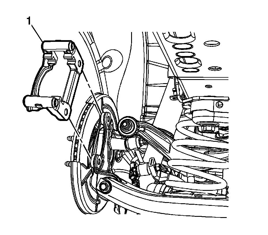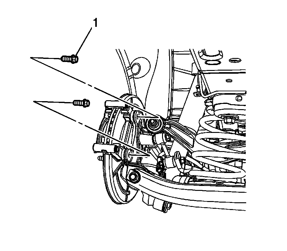 3. Install new brake caliper bracket bolts (1) and tighten to 100 Nm (74 lb ft) + 60 degrees.