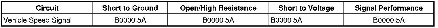 * Vehicle speed from serial data is more than 5 km/h (3 mph) and vehicle speed pulse from the EBCM is 0 km/h (0 mph).