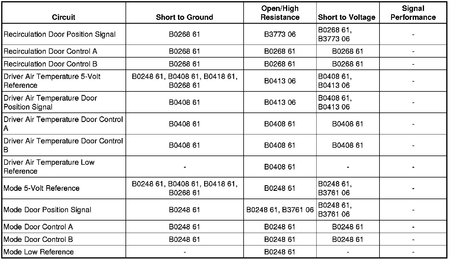 The actual door position differs from the commanded door position by more than 4 counts or the HVAC control module detects the door position signal circuit is less than 7 counts or greater than 250 counts.