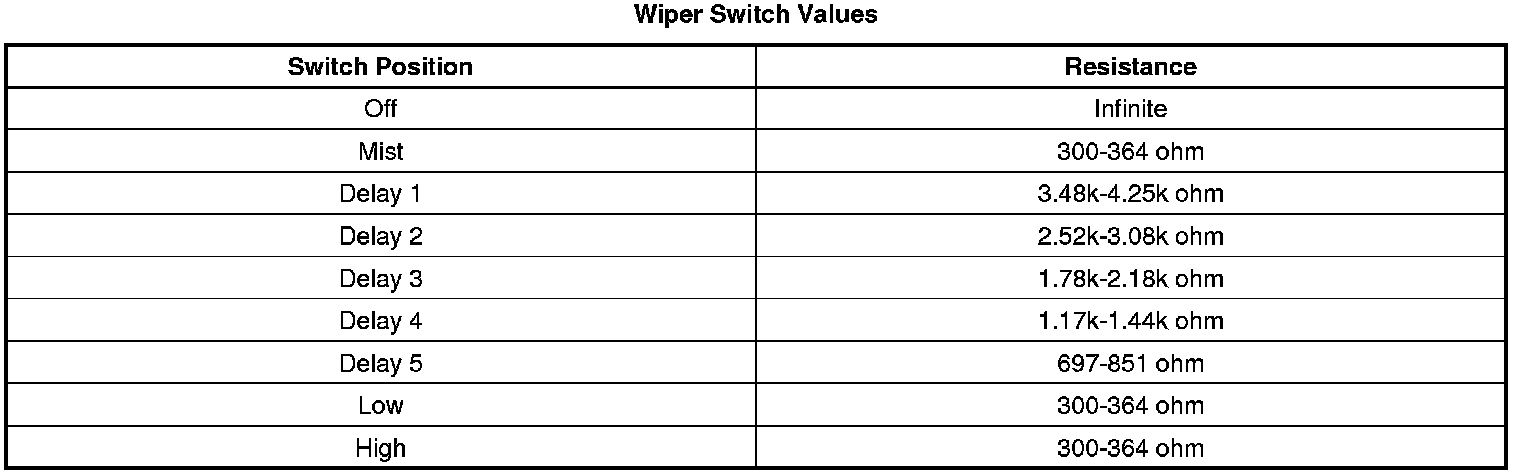 3. While cycling the wiper switch through each delay and speed position, test for the specified resistance between the low reference terminal H and the signal terminal L.