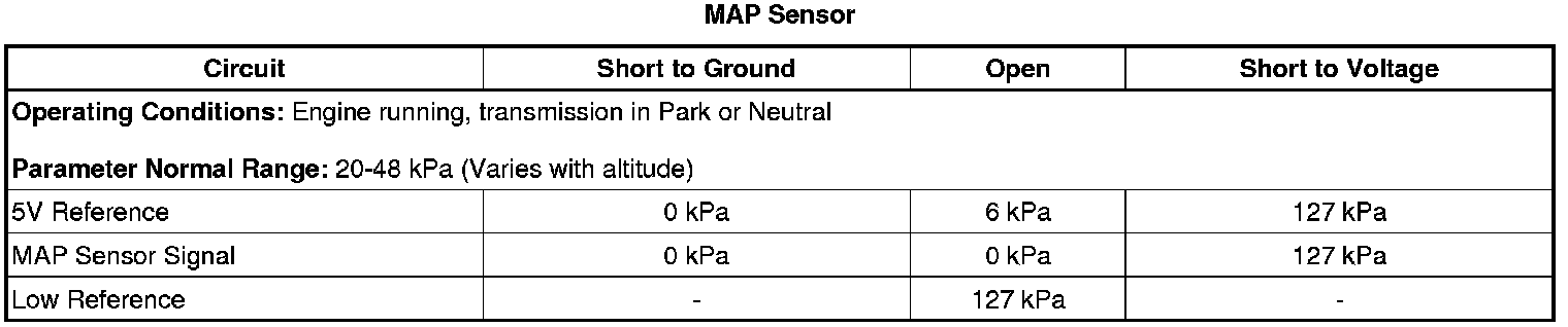 7. Use the scan tool and compare the MAP Sensor parameter to a known good vehicle under various operating conditions. The readings should be within 3 kPa of the known good vehicle.