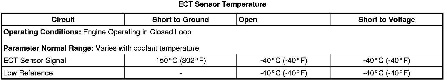 Measure and record the resistance of the ECT sensor at various ambient temperatures, then compare those measurements to the Temperature Versus Resistance (Temperature Versus Resistance) table.