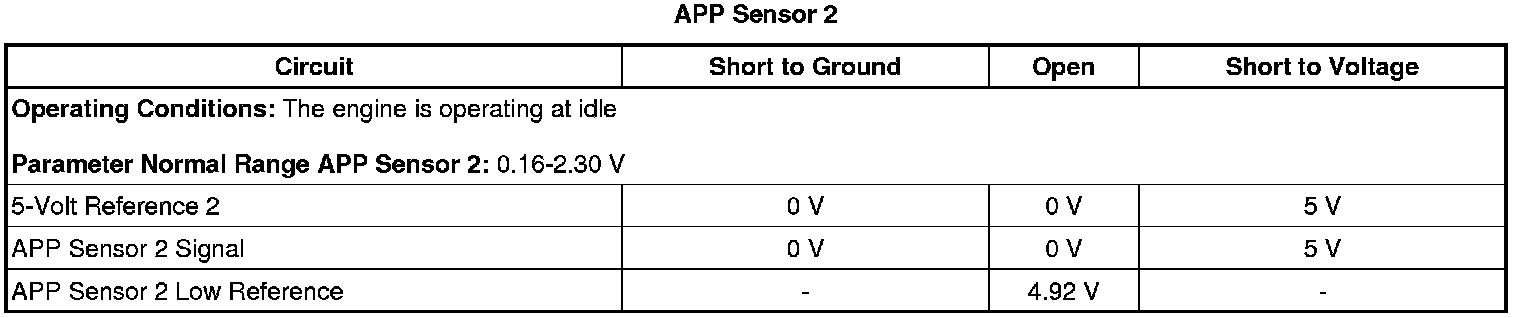 The ECM detects that APP sensor 2 voltage is less than 0.16 volt or greater than 2.30 volts for greater than 0.5 second.