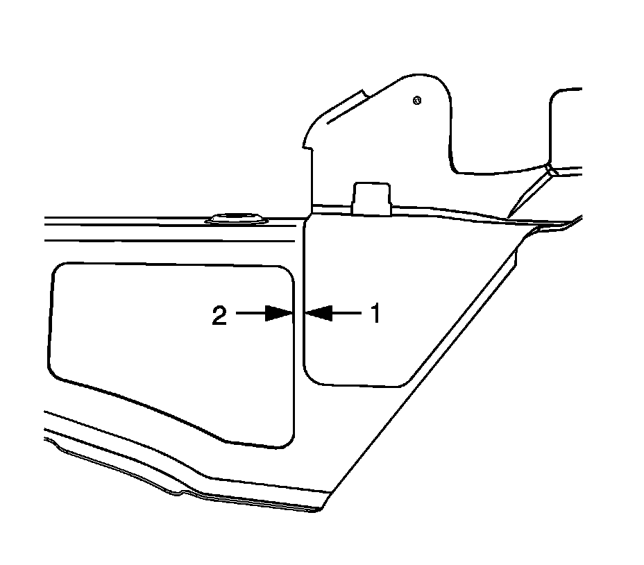 7.If the original location of the hinge can not be determined, locate the front edge of the hinge (1) 5.0 mm (3/16 in) from the rear edge of the clearance hole in the fender rail (2).