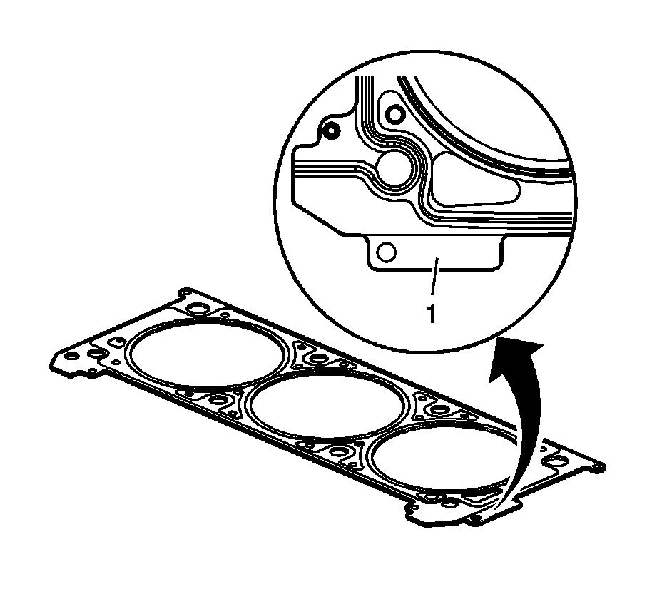Caution: Head gaskets are specific for right hand and left hand applications, and also must be installed with the correct side facing up. Note the markings (1) on the head gaskets for proper installation. Failure to do so may lead to engine damage.