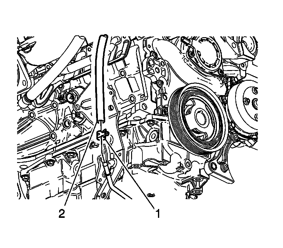 3. Loosen the power steering fluid reservoir inlet hose clamp (1) and disconnect the power steering fluid reservoir inlet hose (2) from the remote power steering fluid reservoir.