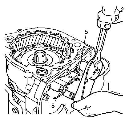 2. Install the forward clutch support studs (5). First tighten the stud closest to the bench (or the rear of the vehicle) to 25-27 Nm (19-20 lb ft). Then tighten the second stud to 25-27 Nm (19-20 lb ft).