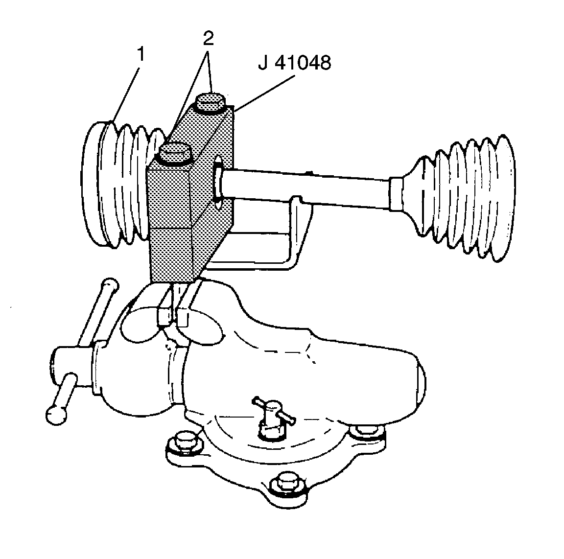 1. Position the inboard end (1) of the halfshaft assembly in tool J 41048.
