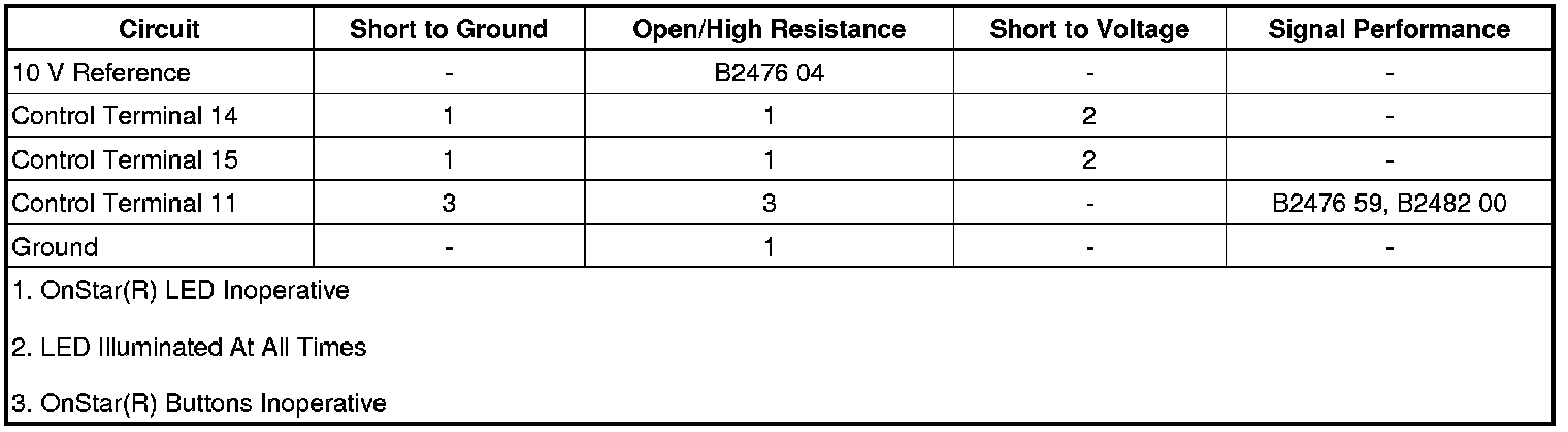 The OnStar(R) button assembly consists of 3 buttons, Call/Answer, OnStar(R) Call Center, and OnStar(R) Emergency. The communication interface module (CIM) supplies the OnStar(R) button assembly with 10 V via the keypad supply voltage circuit. Each of the buttons, when pressed, completes the circuit across a resistor allowing a specific voltage to be returned to the CIM over the keypad signal circuit. Depending upon the voltage range returned, the CIM is able to identify which button has been activated.