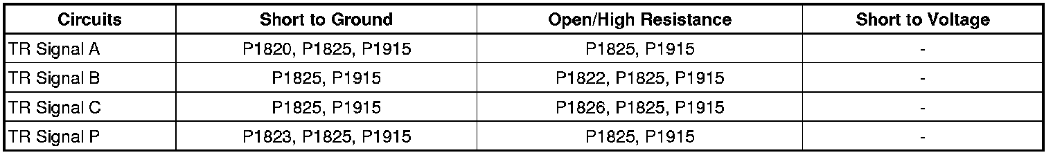 • If any of the TR signal circuits display less than 10 ohms, test the affected TR signal for a short to ground.