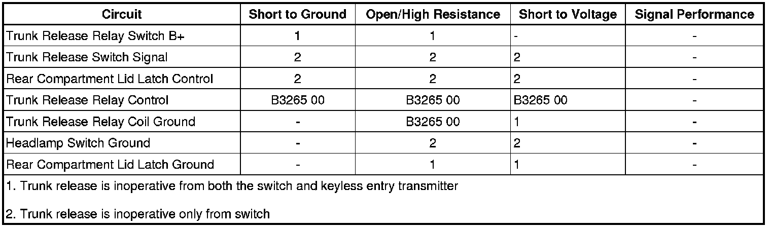 The RR TRN/SIG fuse also provides battery positive voltage to the BCM which provides power to many systems including the trunk release relay switch B+ circuit which, if open, will cause the rear compartment lid latch to become inoperative.