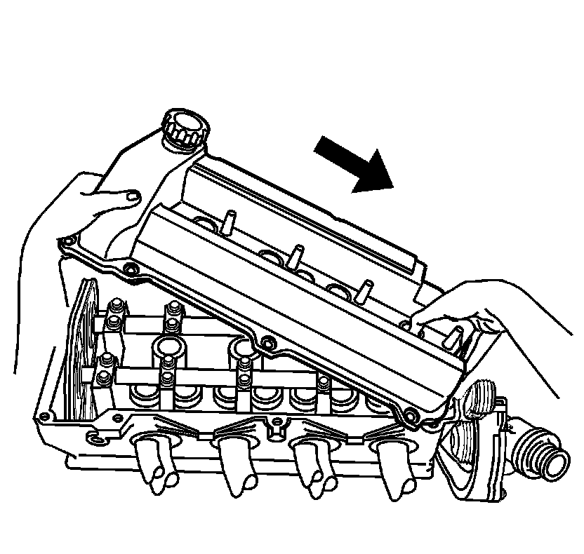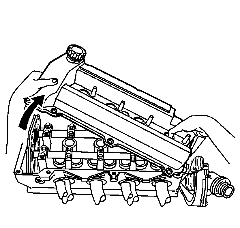 12. Swing the front of the cover over the intake manifold while sliding the entire cover over the end of the camshaft.