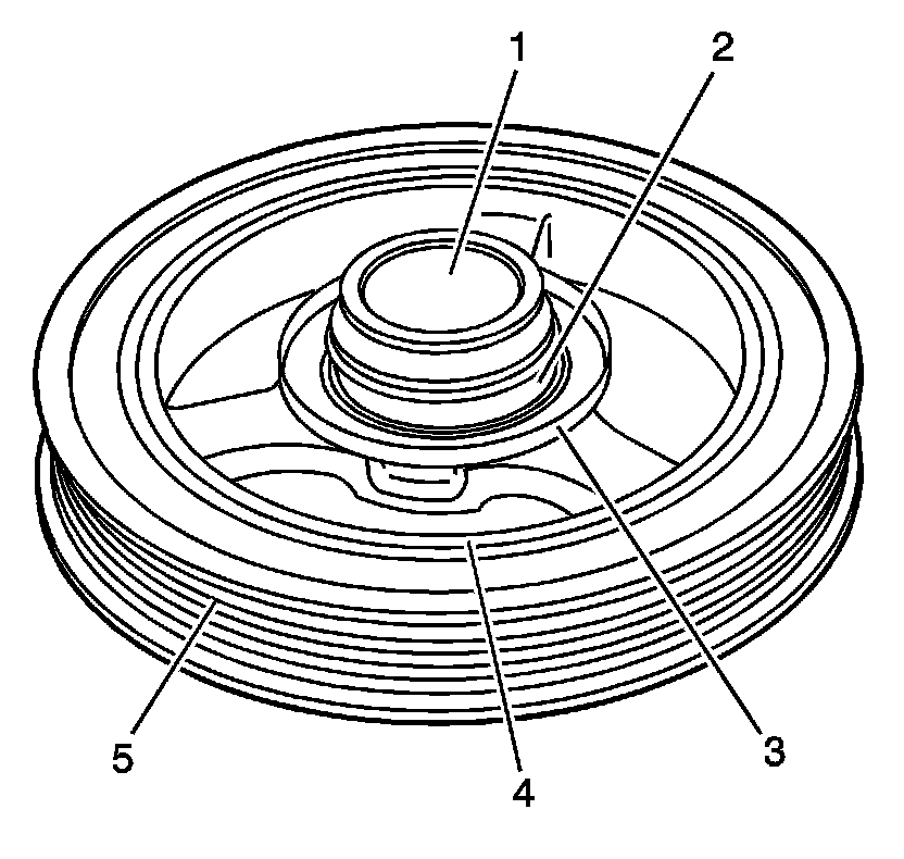 * Worn, chunking, or deteriorated rubber between the hub and pulley (4)