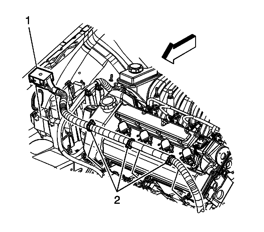 61. Install the engine harness clip (2) to the fuel rail stud.