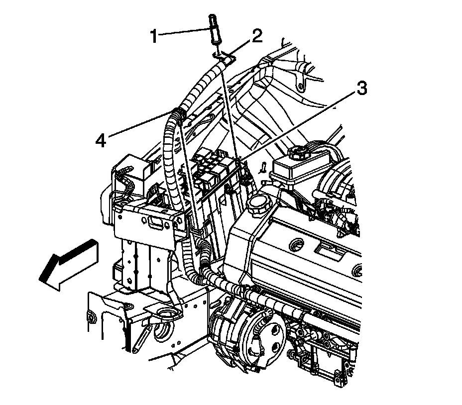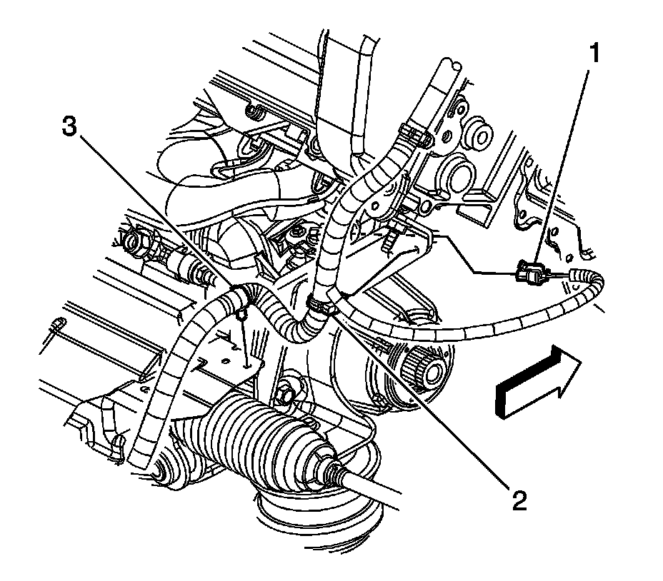52. Install the engine harness clips (2, 3) to the rear engine mount bracket and steering gear shield.