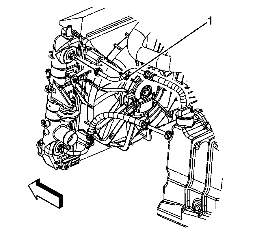 123. Tighten the upper transaxle oil cooler pipe bolt (1) to the fan shroud.