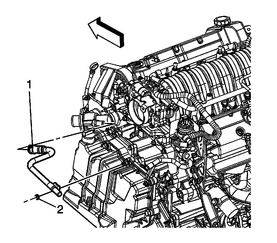 130. Install the radiator outlet hose (2) to the thermostat housing.