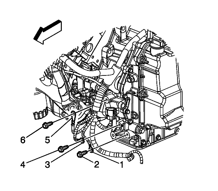 42. Install the engine harness ground bolts (2, 4, and 6).