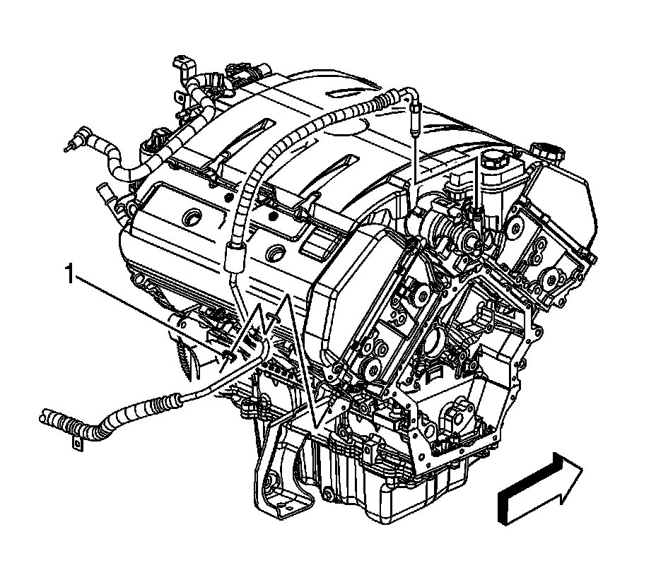 48. Install the engine harness clip (1) to the boss on the engine block.