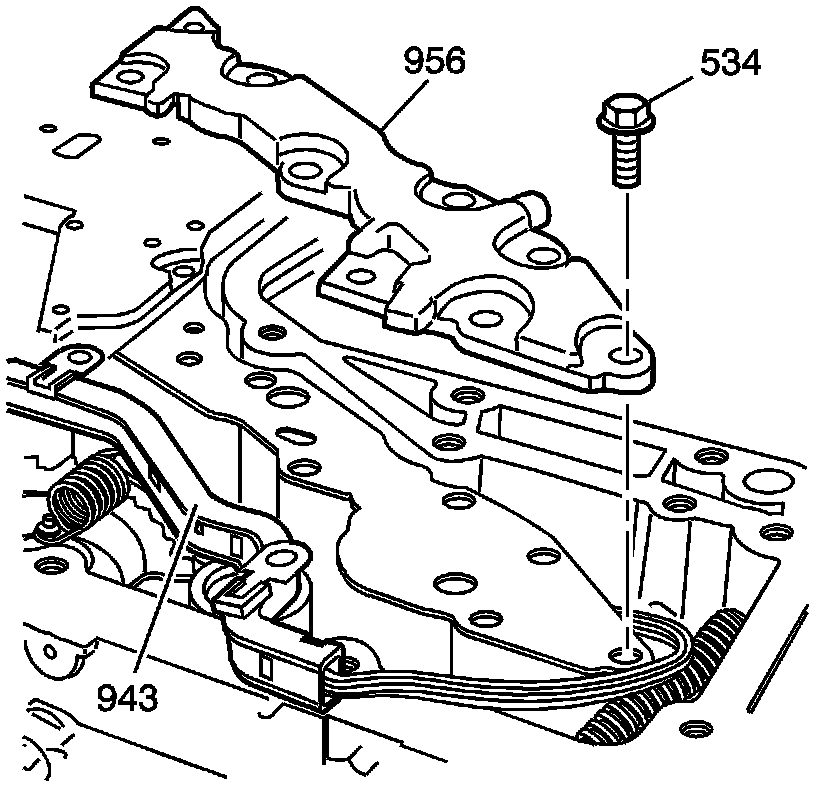 1. Remove the nine 10 mm bolts (534) from the oil transfer plate (956) and wire harness assembly (943).