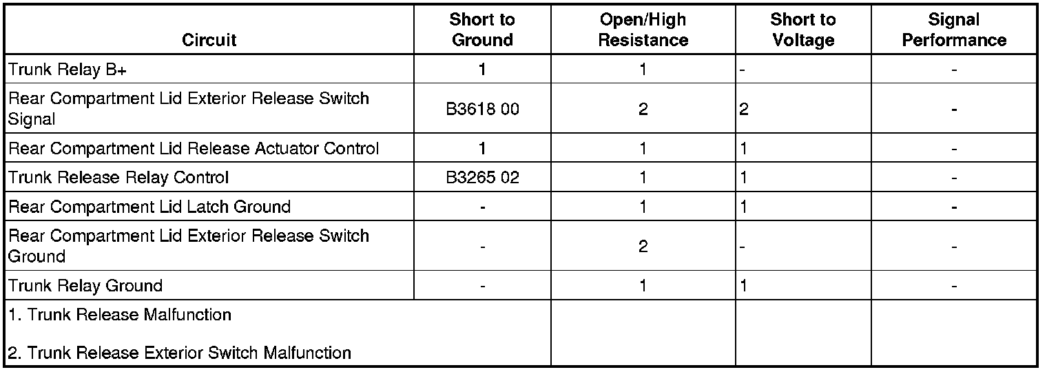 The body control module (BCM) supplies a reference voltage to the rear compartment lid unlatch switch through the release switch signal circuit. When the rear compartment lid unlatch switch is pressed, the release switch signal circuit is grounded through the rear compartment lid unlatch switch ground circuit and the reference voltage is pulled low within the BCM. In response, the BCM applies battery positive voltage to the compartment lid release relay control circuit, which energizes the coil side of the relay. The switch side of the compartment lid release relay then closes, supplying battery positive voltage through the relay and the rear compartment lid latch control circuit activating the latch so that the trunk lid may be manually raised to an open position.