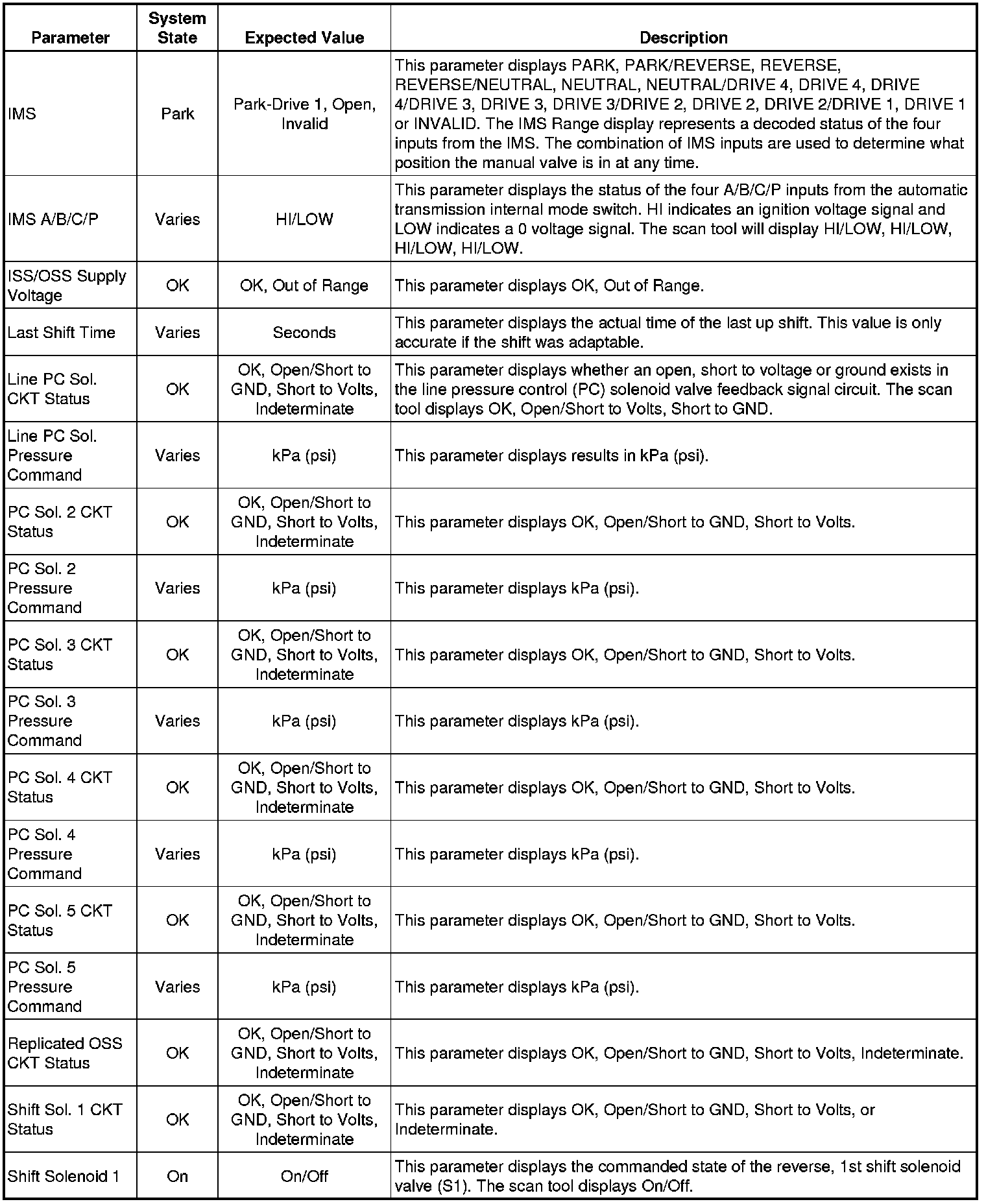The Transmission Control Module Scan Tool Data List contains all transmission related parameters that are available on the scan tool. The list is arranged in alphabetical order. A given parameter may appear in any one of the data lists, and in some cases may appear more than once, or in more than one data list in order to group certain related parameters together.
