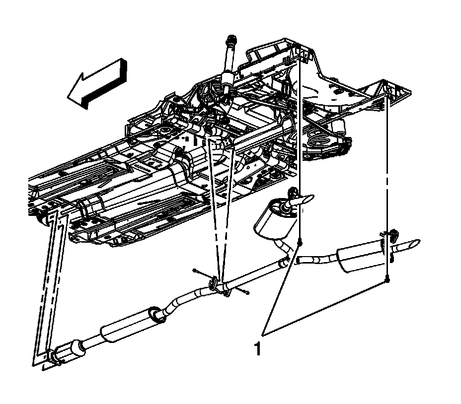 8. Remove the rear exhaust hanger bracket to the rear compartment side rail bolts (1).