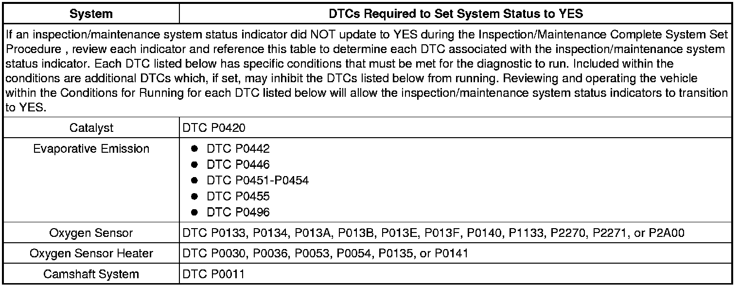Inspection/Maintenance (I/M) Test DTC Table
