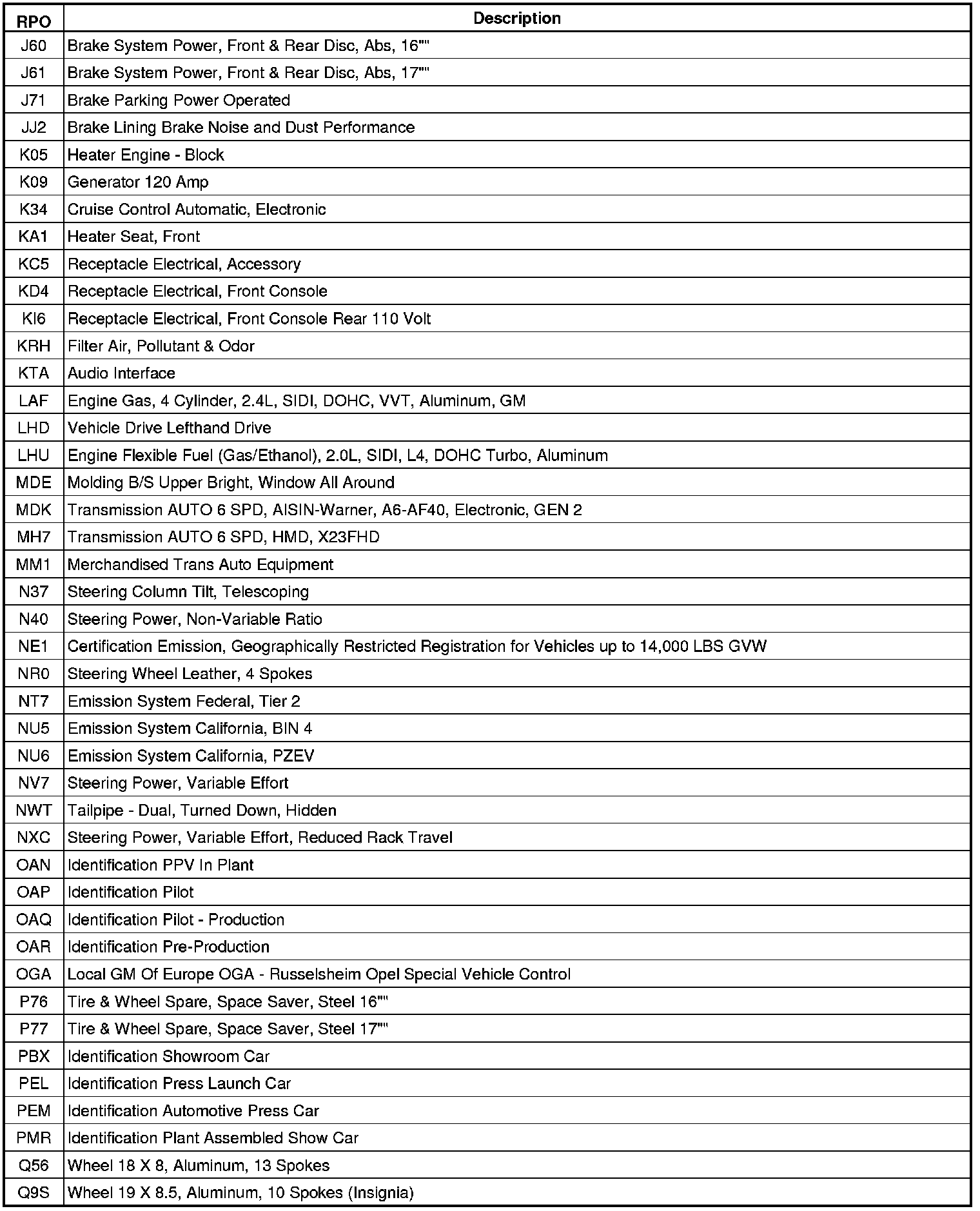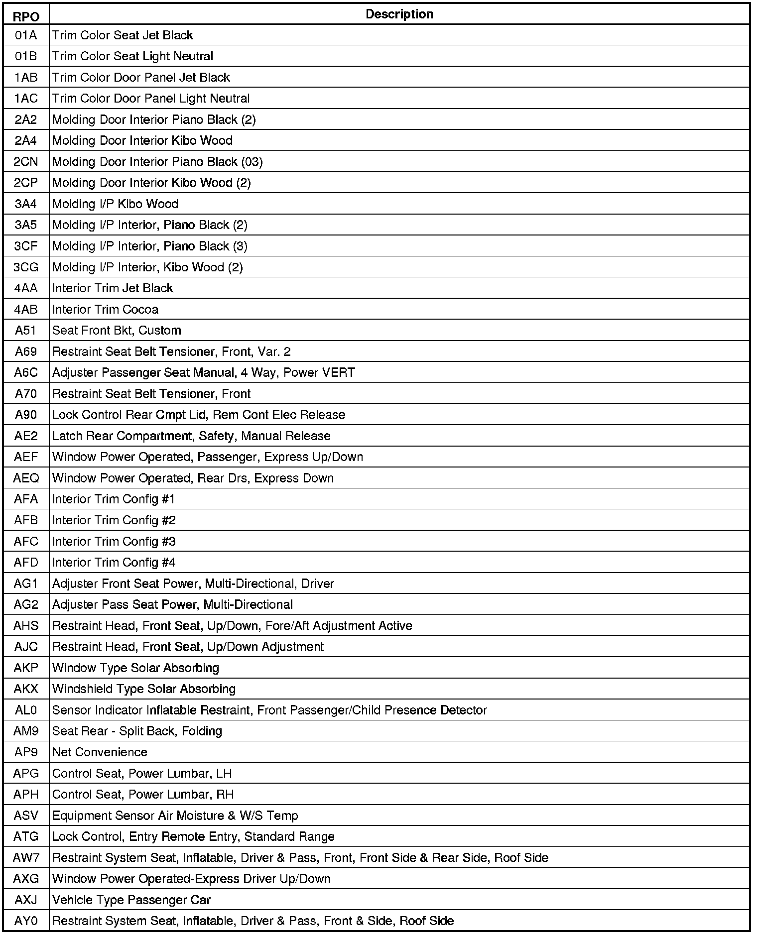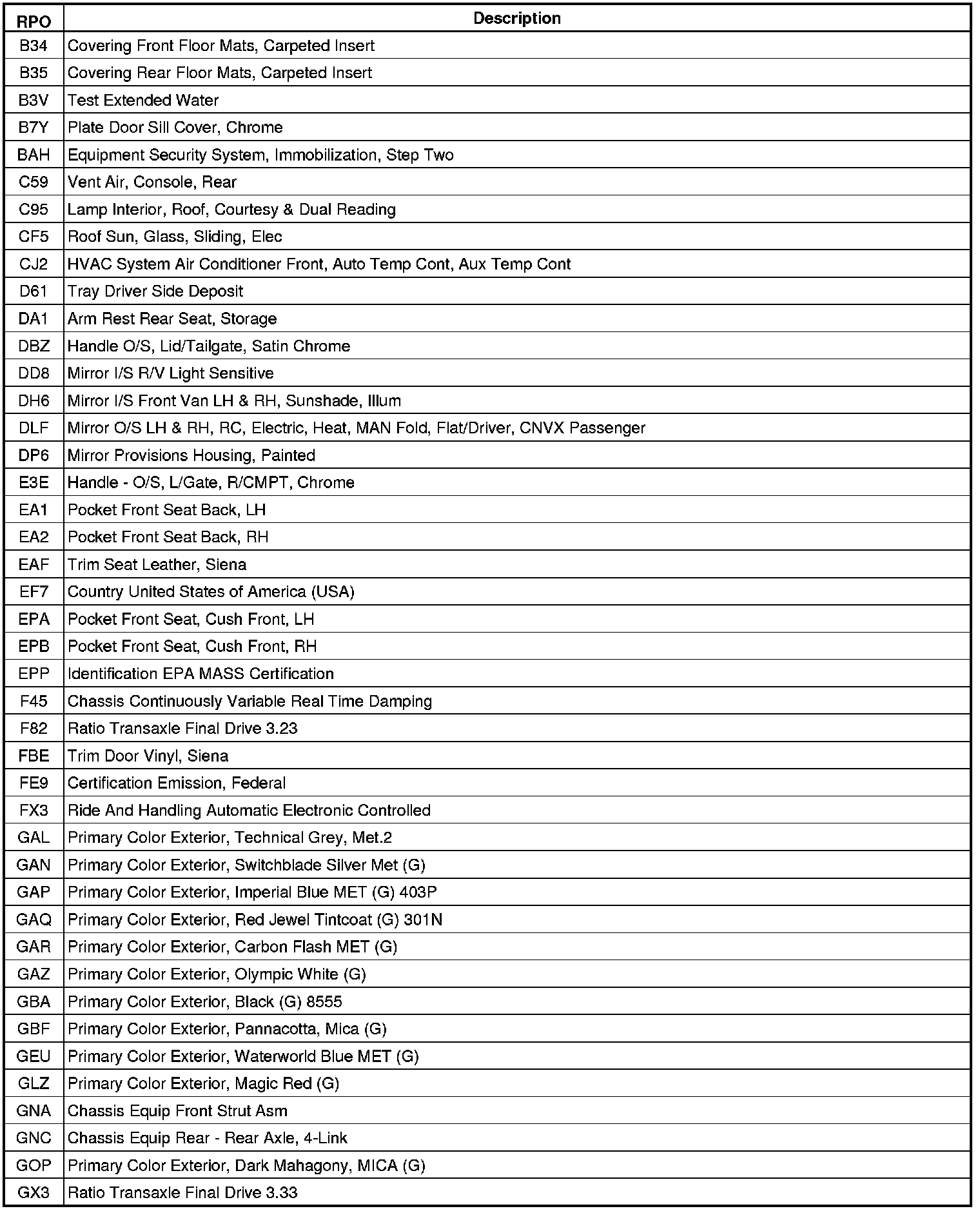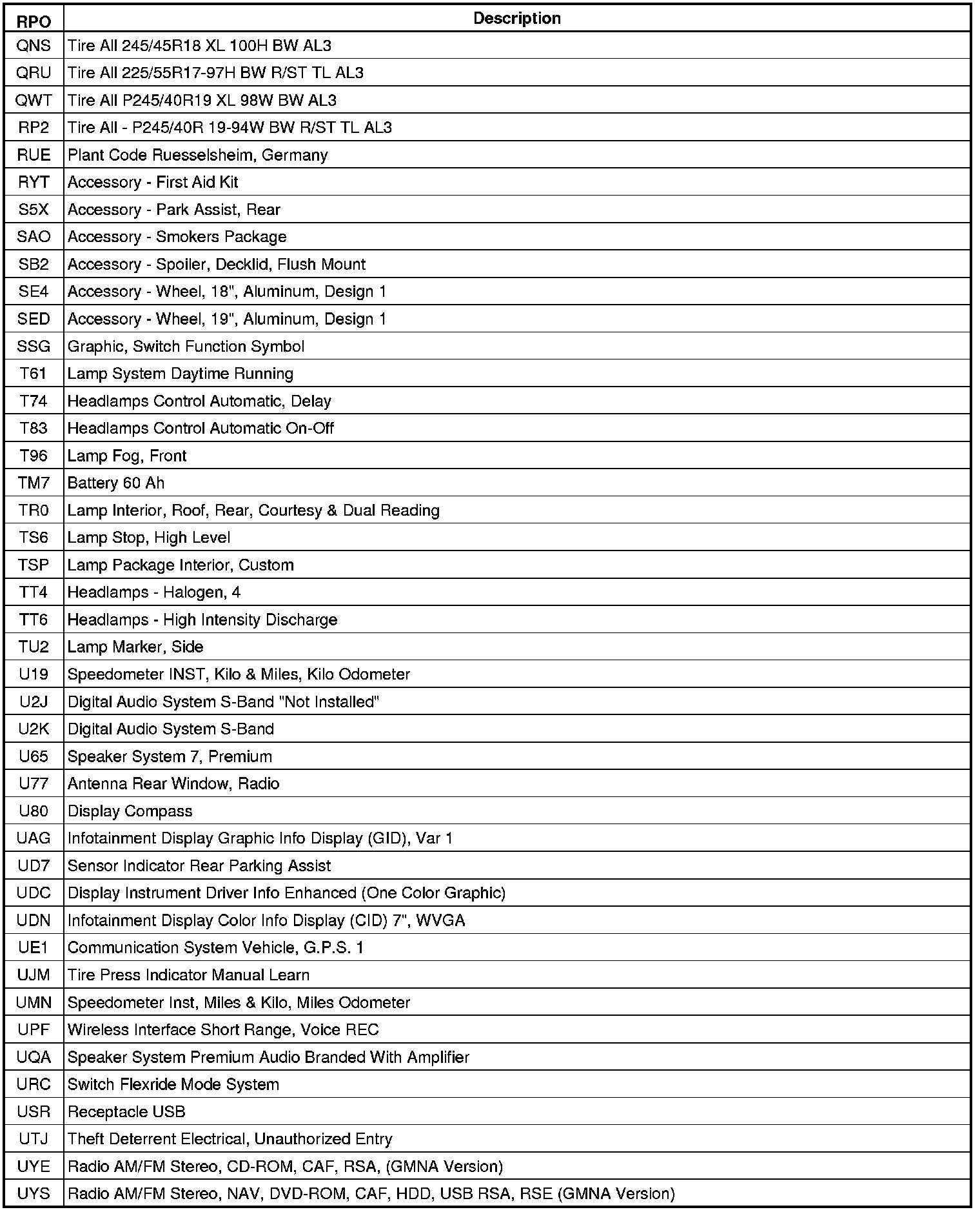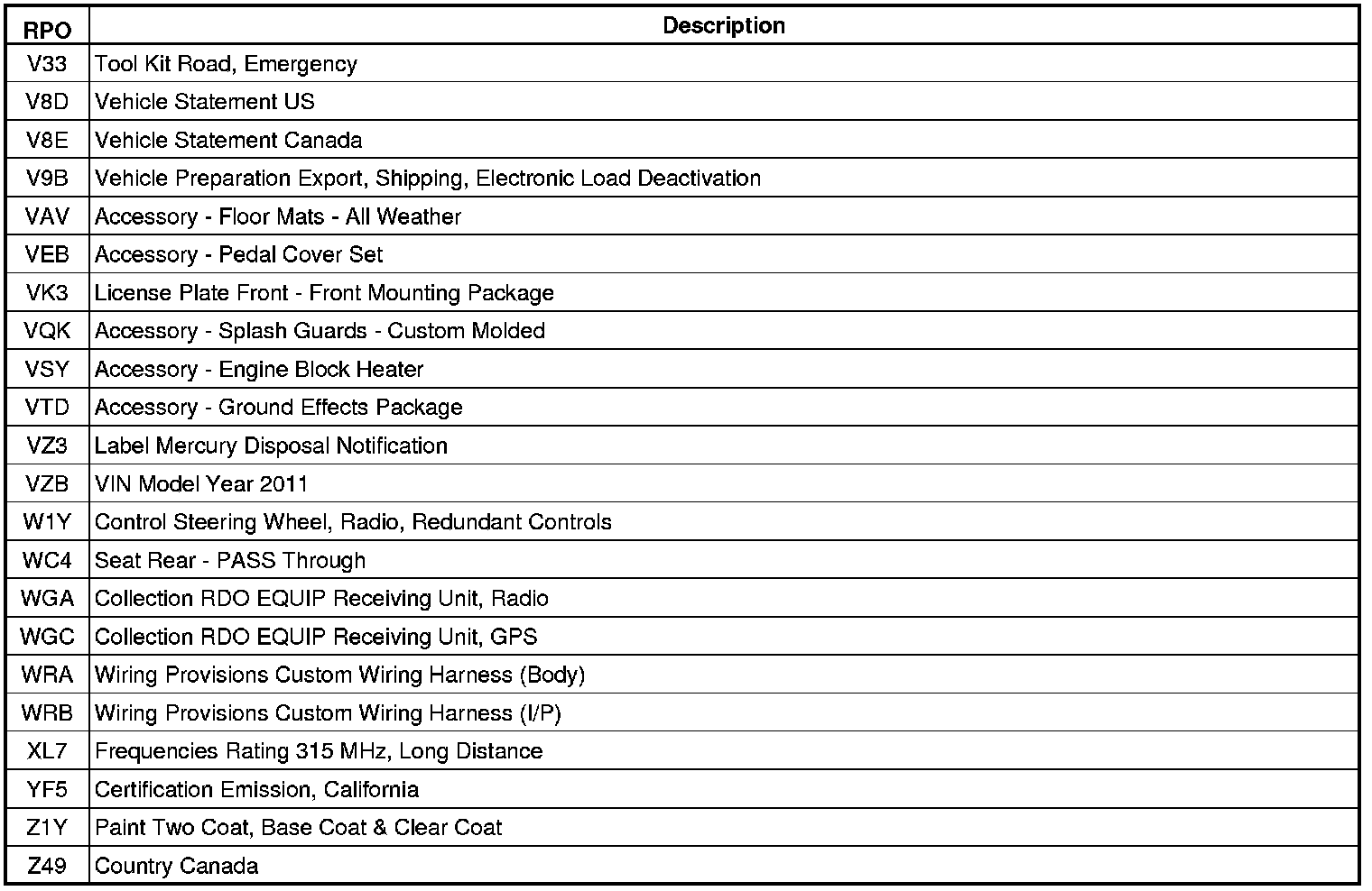 The following table provides the description of the Regular Production Option (RPO) codes that are available on the vehicle. The vehicle's RPO list is printed on the Service Parts Identification Label.