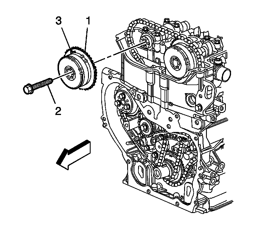 15. Remove the intake camshaft actuator (3), and the timing chain through the top of the cylinder head.