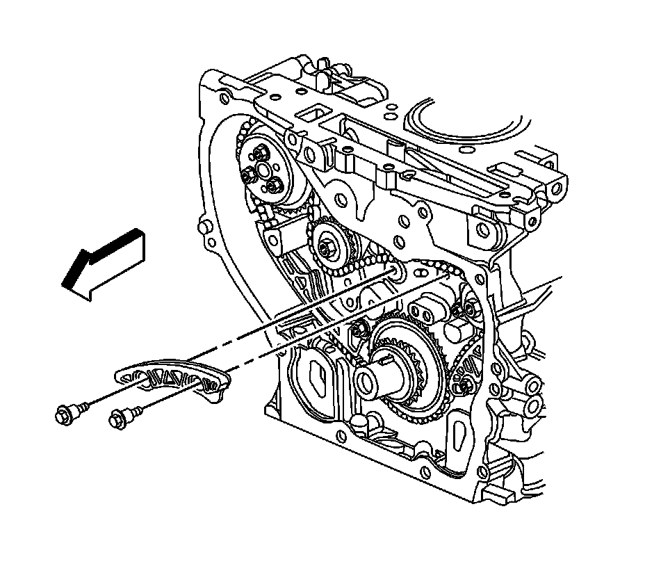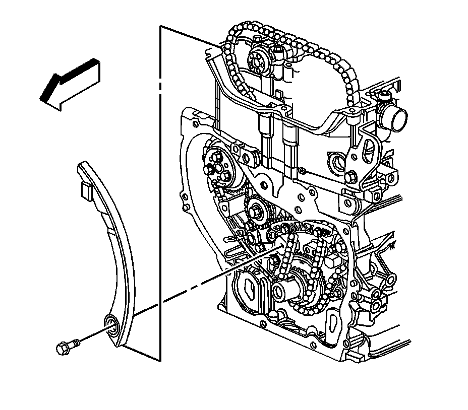 Note: The timing chain tensioner must be removed to unload chain tension before the timing chain is removed. If it is not, the timing chain will become cocked and it will be difficult to remove.