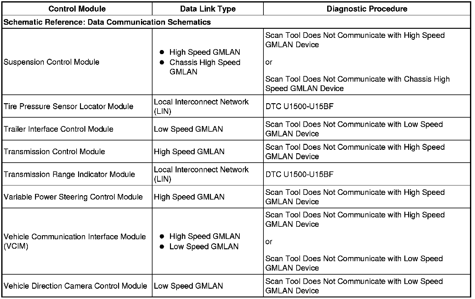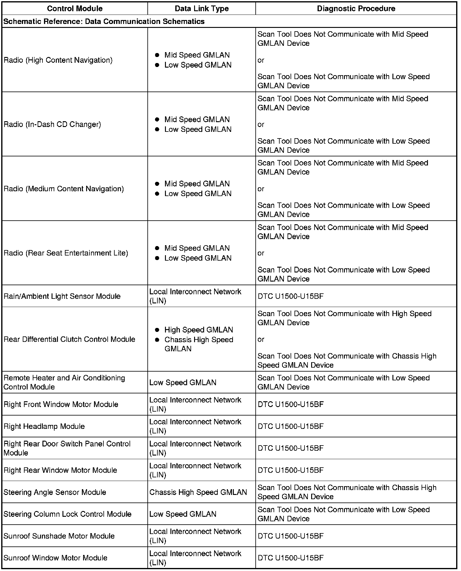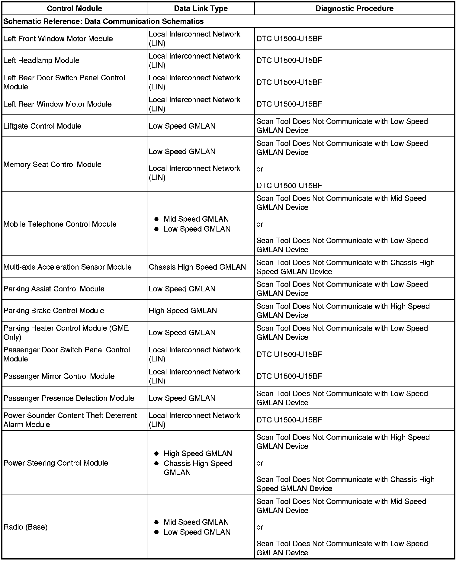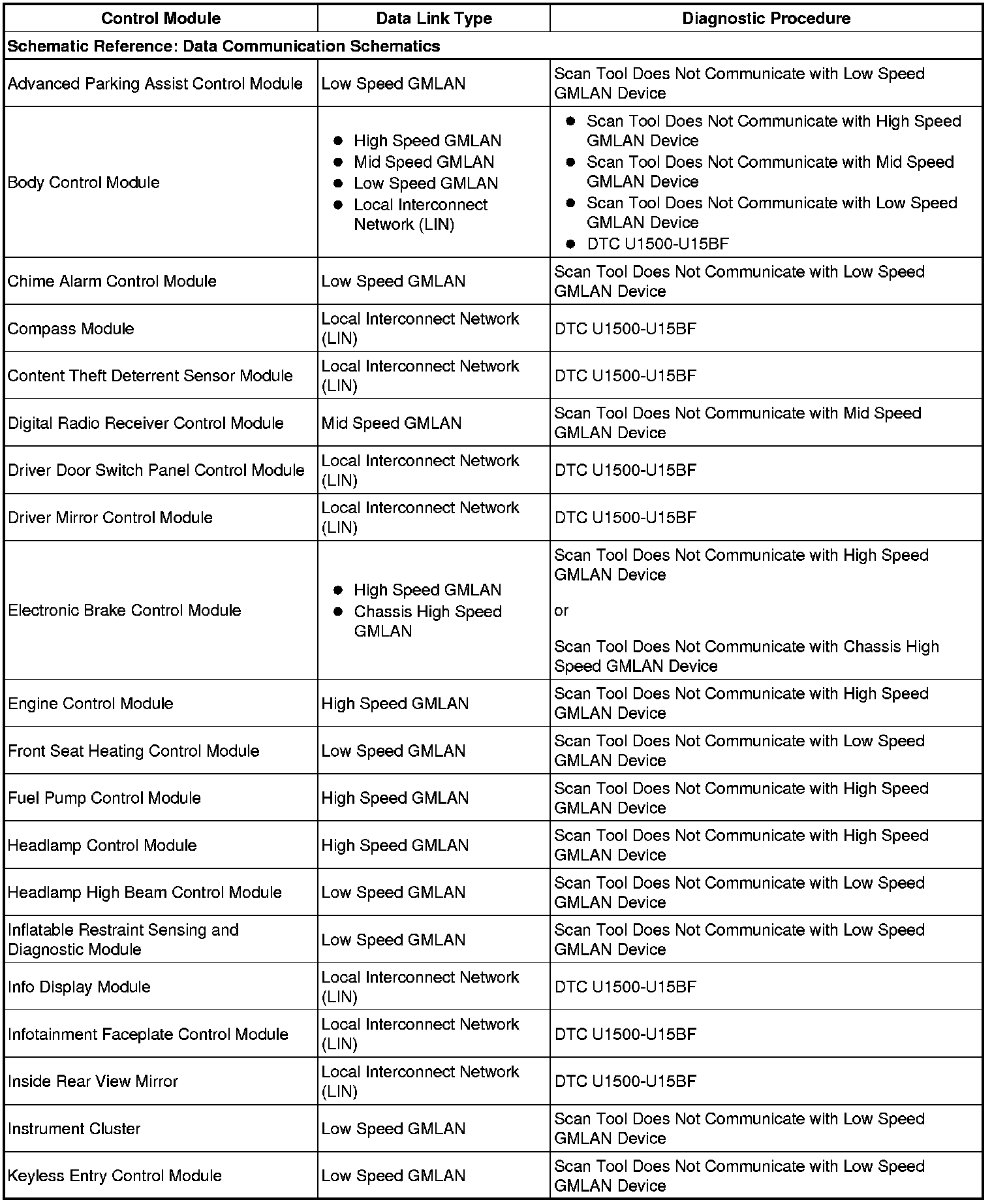 This table identifies which serial data link that a particular module uses for in-vehicle data transmission. Some modules may use more than one data link to communicate. Some modules may have multiple communication circuits passing through them without actively communicating on that data link. This table is used to assist in correcting a communication malfunction. Not all modules listed will be applicable to all vehicles. Refer to the schematics to determine which modules apply. For the description and operation of these serial data communication circuits refer to Data Link Communications Description and Operation (Description and Operation).