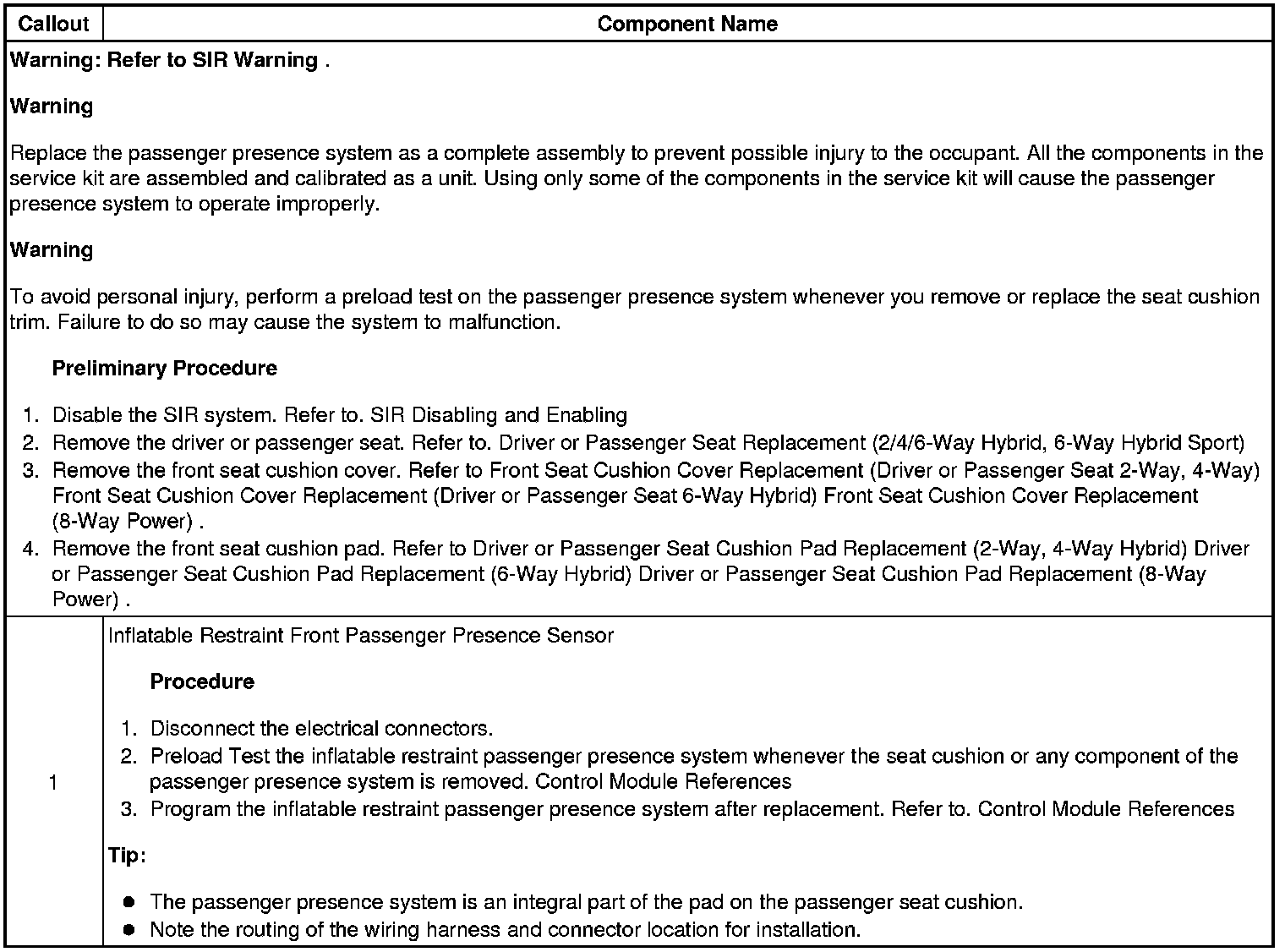 Inflatable Restraint Front Passenger Presence Sensor Replacement
