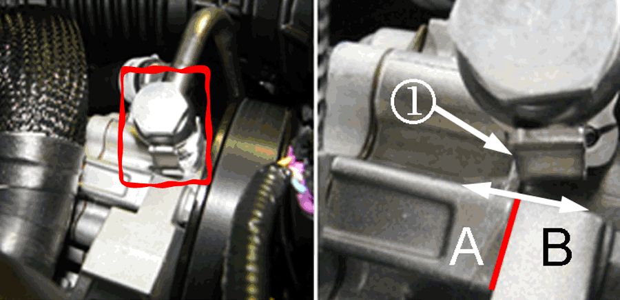 The power steering line banjo fitting has a locking device (1). The locking device is in the correct position if the stop position is BEFORE the wall of the power steering pump. Refer to the red line in the illustration. (A) Incorrect Position (B) Correct Position.